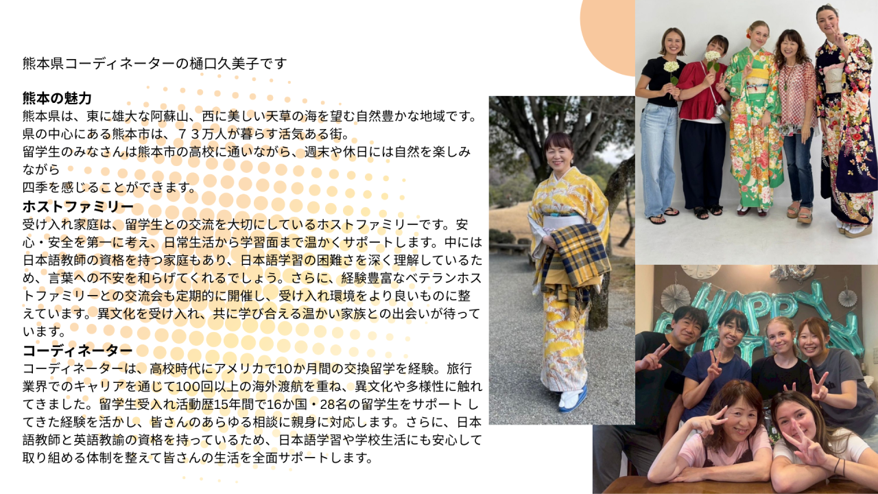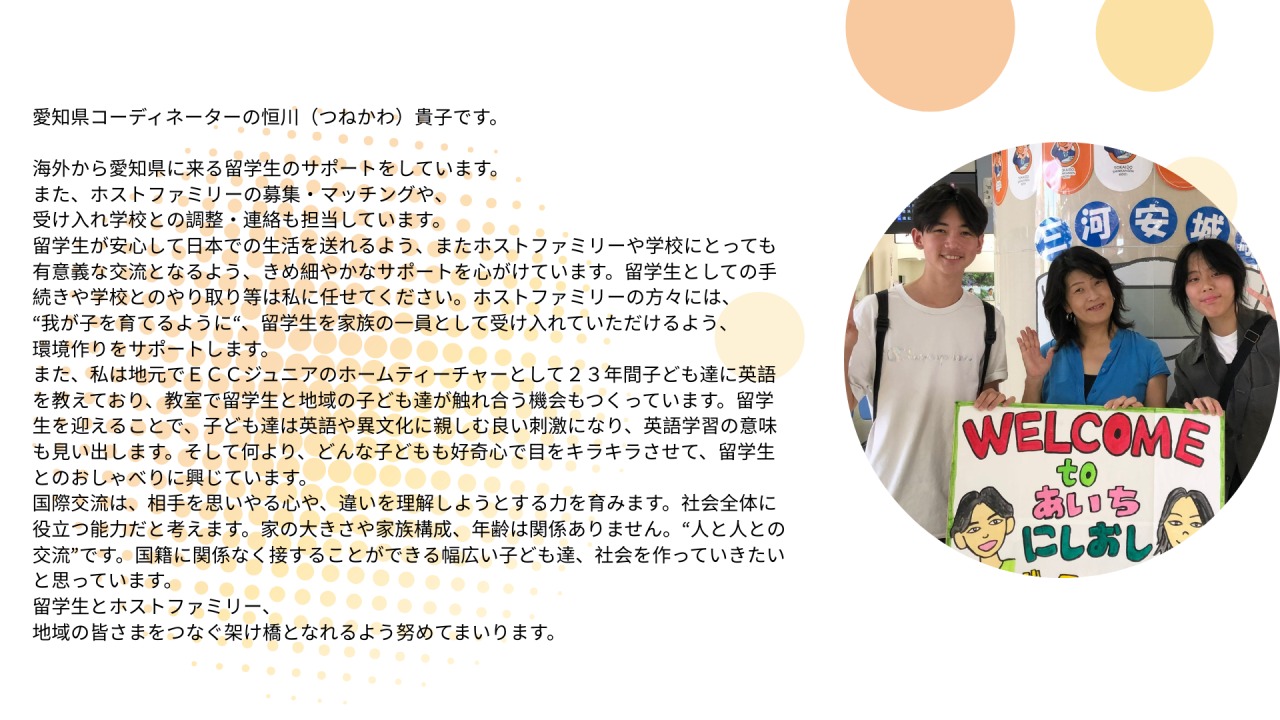 社会に出るにあたり、いわゆる「英語を活かした仕事」として何をしたいのかも浮かばず、とりあえず就いた仕事は、子供英会話講師でした。その仕事4年目で、ハワイに小学生高学年20名ほどを引率し、現地の小学生と合同キャンプをしたことがあります。その時に子供たち同士が、互いに習っていた英語、日本語を発しながらとても楽しそうに遊んでいる姿を見て、このような場面を作る仕事にかかわりたいと思い転職をしました。それが、1982年に入職した高校留学手配団体でした。 子育て期間中は、子供英会話講師、ボーイスカウト活動などに携わりました。その後社会復帰から、定年まで高校留学に従事し、今は個人団体として自分なりの理想の姿で高校留学生の受入れ事業のみを行っています。 日本は今や、インバウンドの観光客を多く迎えていますが、高校留学は趣が違います。ホストファミリーの中で、家族の一員として過ごしますので留学生を受け入れた家庭にとっても留学生にとっても一生お付き合いのできる関係を築くことができます。そして我々日本人も、日本文化を見つめるとても良い機会になります。キラキラ、ひらひらの着物もかわいいけれど、本来の着物文化をご一緒に学んでみませんか。茶道も書道も、その道を極めるに至らずとも、文化として説明ができる日本人でありたいものです。和食は、ユネスコの無形文化遺産です。素晴らしい祭りが各地にあります。